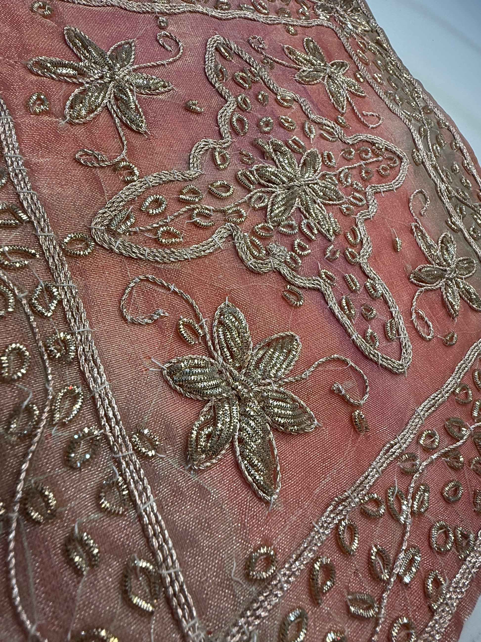 Border: Embellished with wavy gold/silver embroidered border interspersed with small decorative shapes.