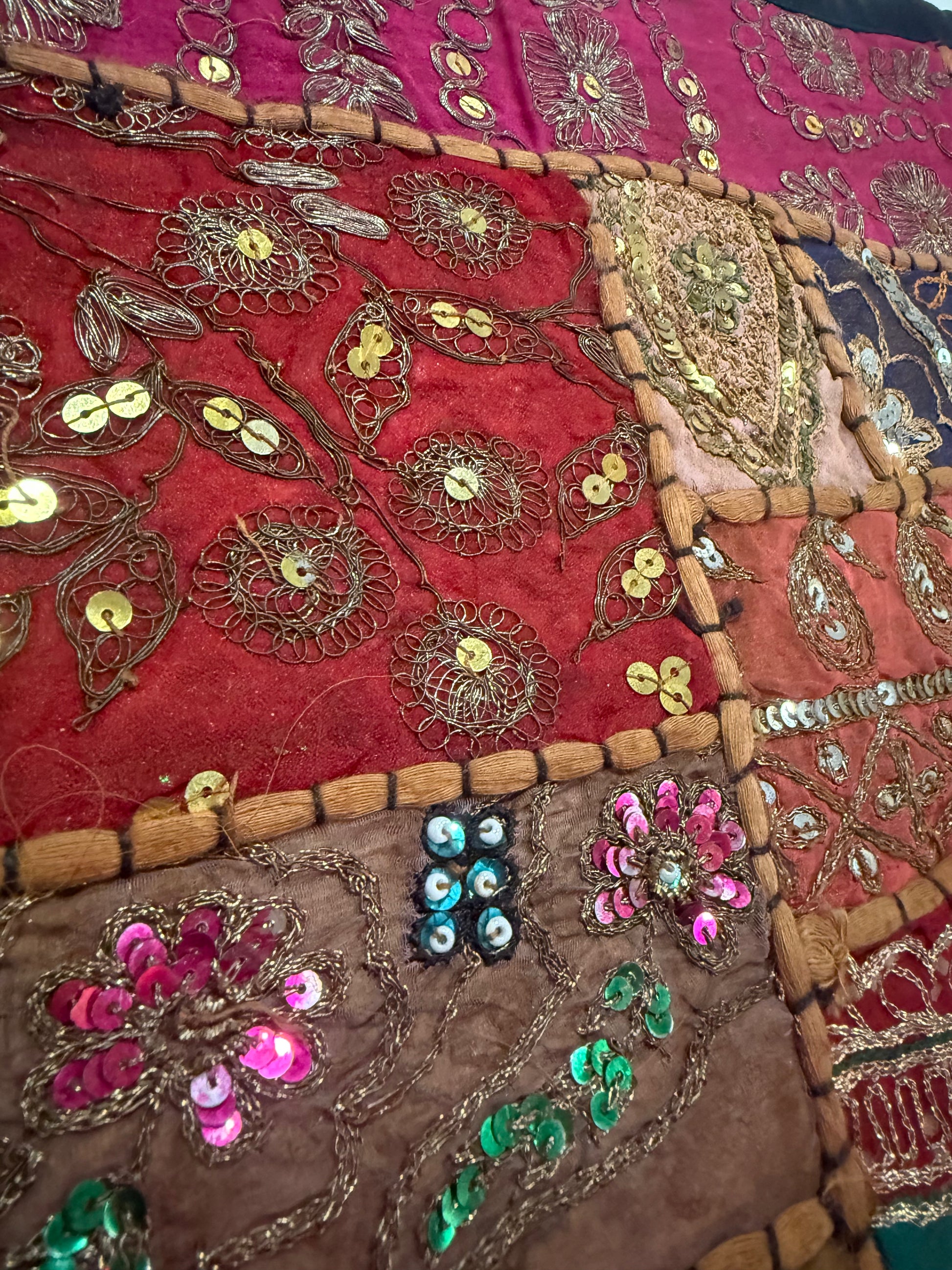 - Embroidery: Each pillow case contains intricate embroidery and beaded emblemishments, including floral and paisley-like motifs. The Embroidery is done using various silver and gold threads and sequined patchwork.