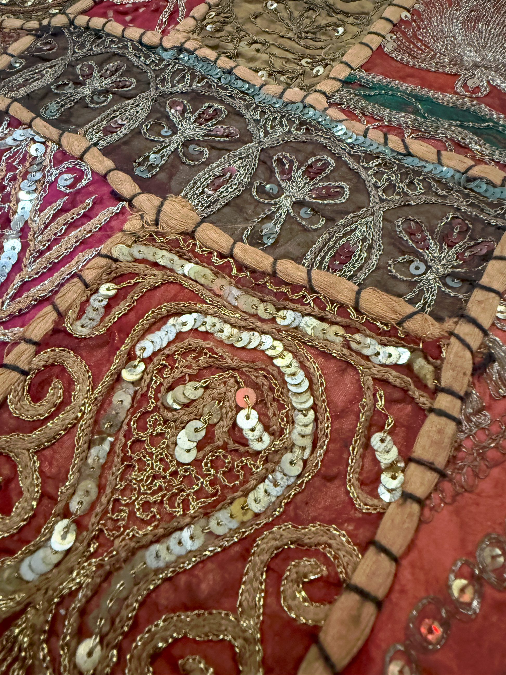 - Embroidery: Each pillow case contains intricate embroidery and beaded emblemishments, including floral and paisley-like motifs. The Embroidery is done using various silver and gold threads and sequined patchwork.