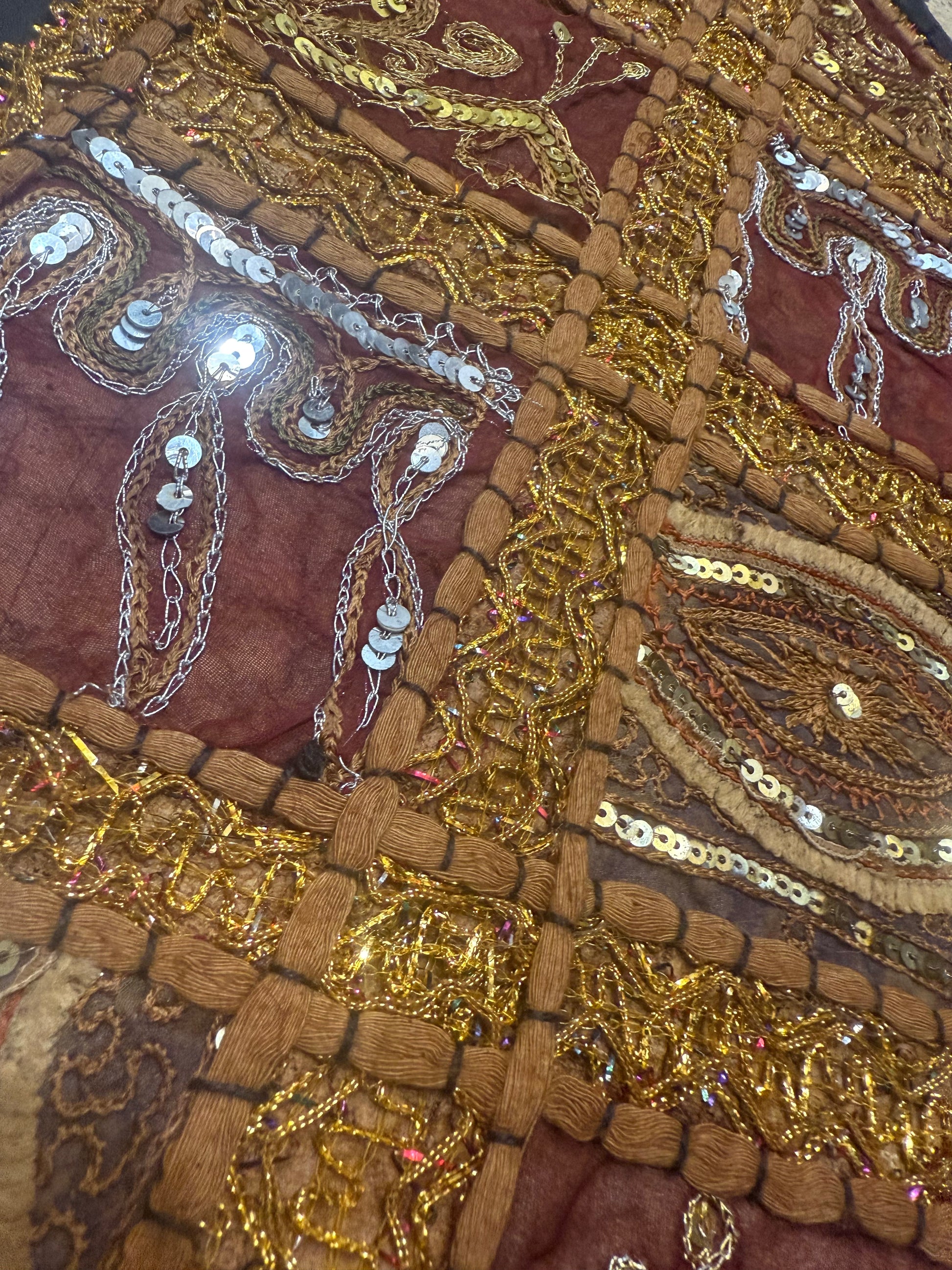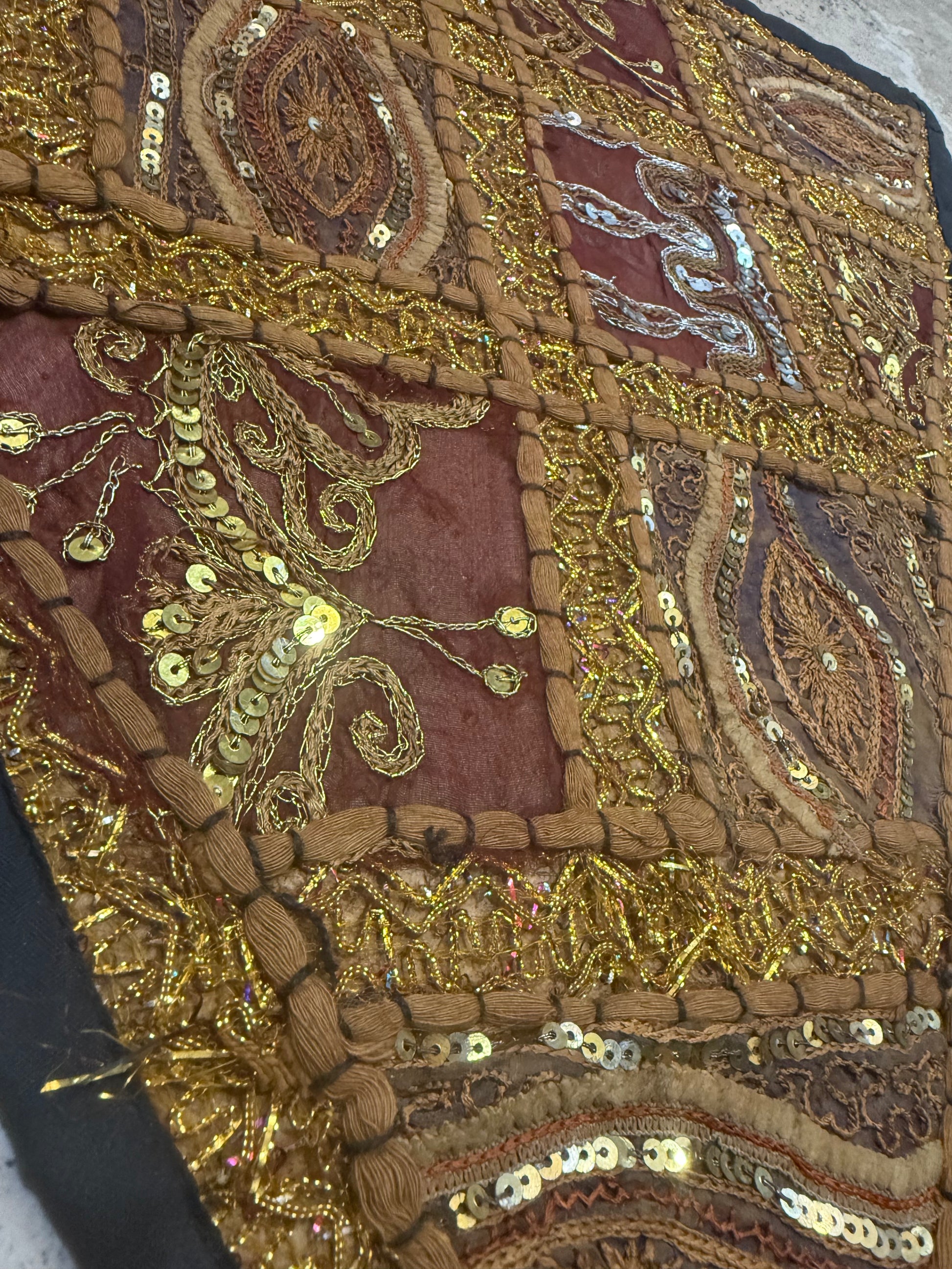 - Embroidery: Each pillow case contains intricate embroidery and beaded emblemishments, including floral and paisley-like motifs. The Embroidery is done using various silver and gold threads and sequined patchwork.