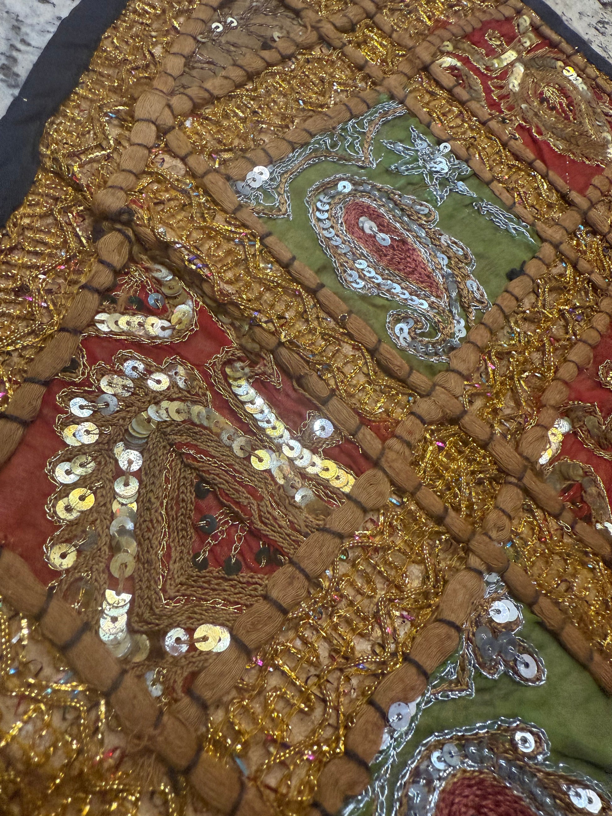 - Embroidery: Each pillow case contains intricate embroidery and beaded emblemishments, including floral and paisley-like motifs. The Embroidery is done using various silver and gold threads and sequined patchwork.