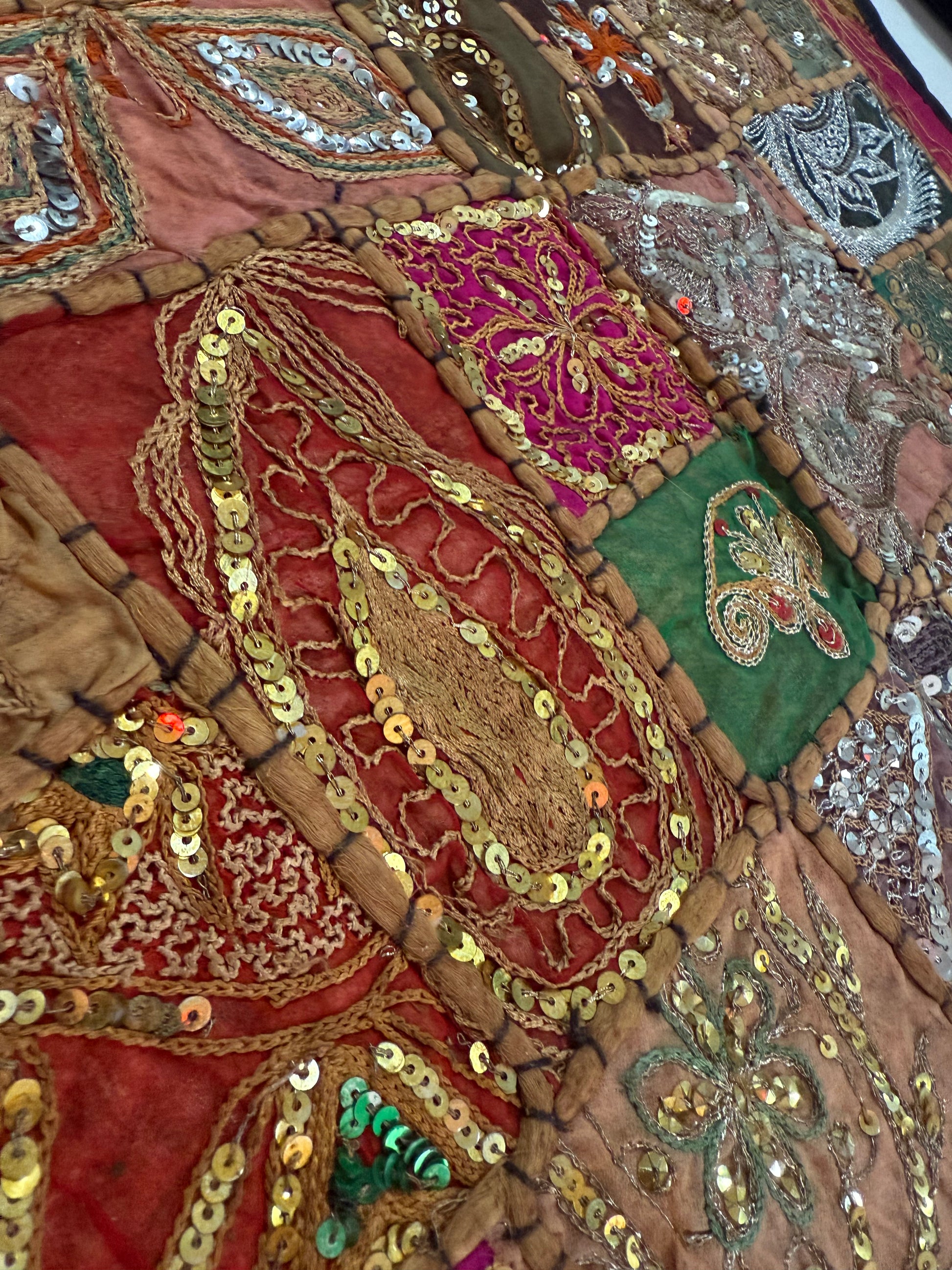 - Embroidery: Each pillow case contains intricate embroidery and beaded emblemishments, including floral and paisley-like motifs. The Embroidery is done using various silver and gold threads and sequined patchwork.