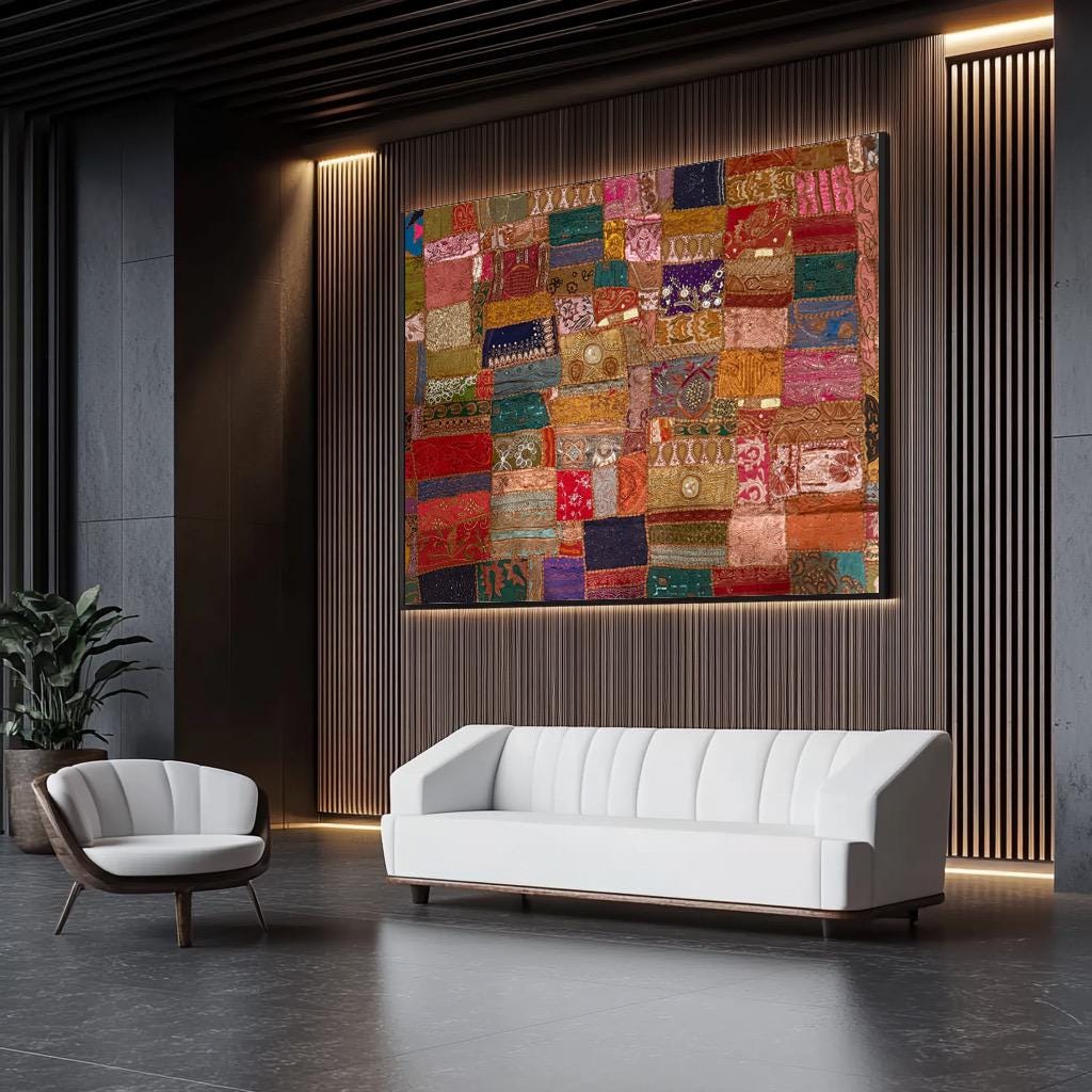 This tapestry embodies the artistic traditions of Rajasthan, one of India’s most culturally rich states. By incorporating fabrics from vintage saris and ceremonial clothing, artisans breathe new life into textiles once worn during weddings, festivals, and celebrations.