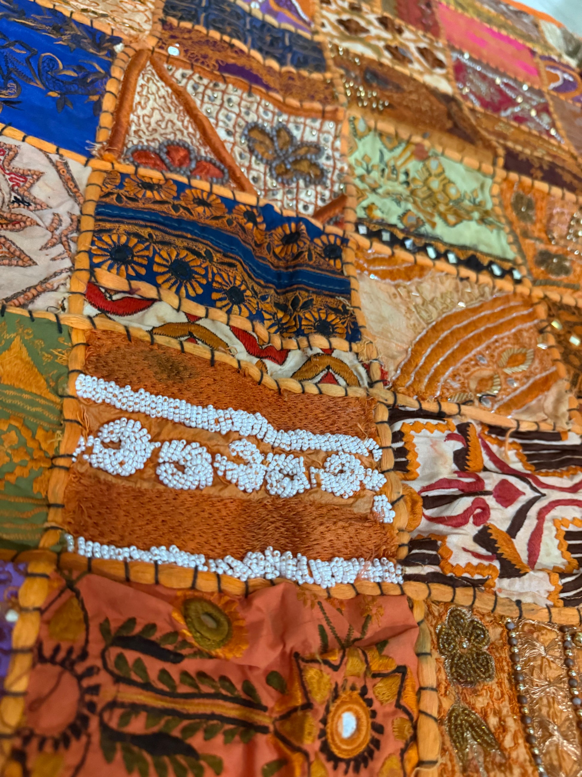 This tapestry is a true reflection of Rajasthani artistry, incorporating techniques passed down through generations. Many patches used in this piece come from old saris and bridal lehengas, featuring hand-embroidered beadwork, sequins, tiny mirrors, zardosi threads, and lace. Each section carries cultural symbolism and a touch of history.