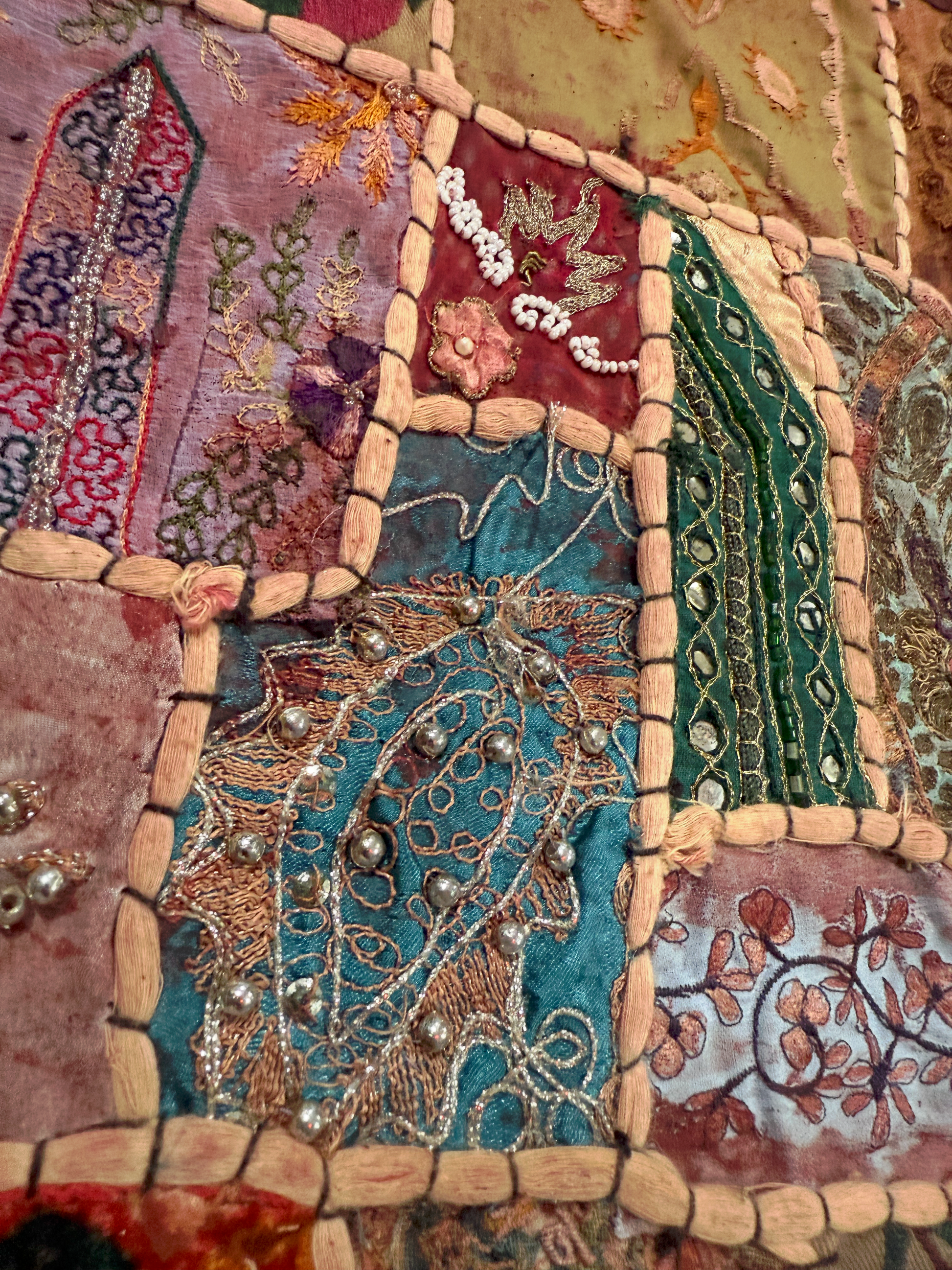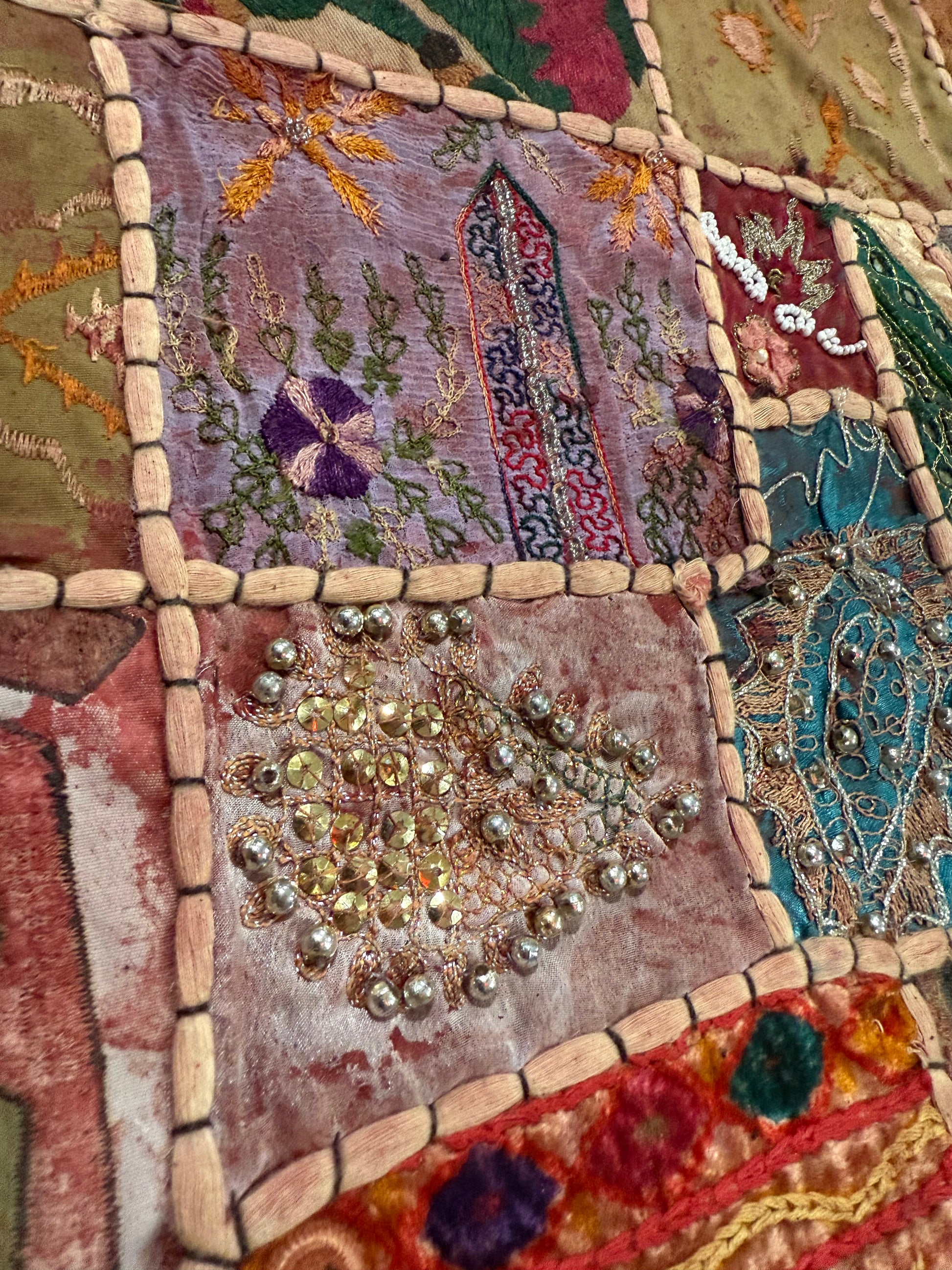 - Embroidery: Each pillow case contains intricate embroidery and beaded emblemishments, including floral and paisley-like motifs. The Embroidery is done using various silver and gold threads and sequined patchwork.